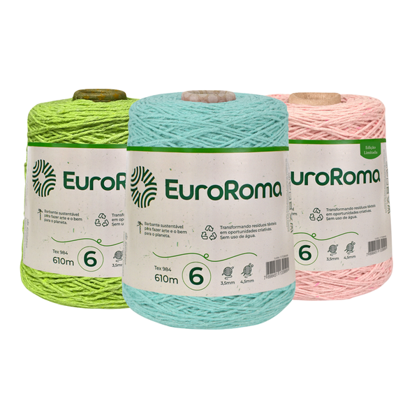 Perfeito para crochê, tricô, macramê e amigurumi, o barbante EuroRoma é ideal para tapetes, sousplats, mantas, bolsas e outros itens decorativos e utilitários. Sua versatilidade permite a criação de peças únicas e sustentáveis.